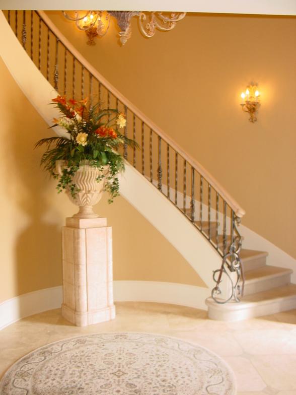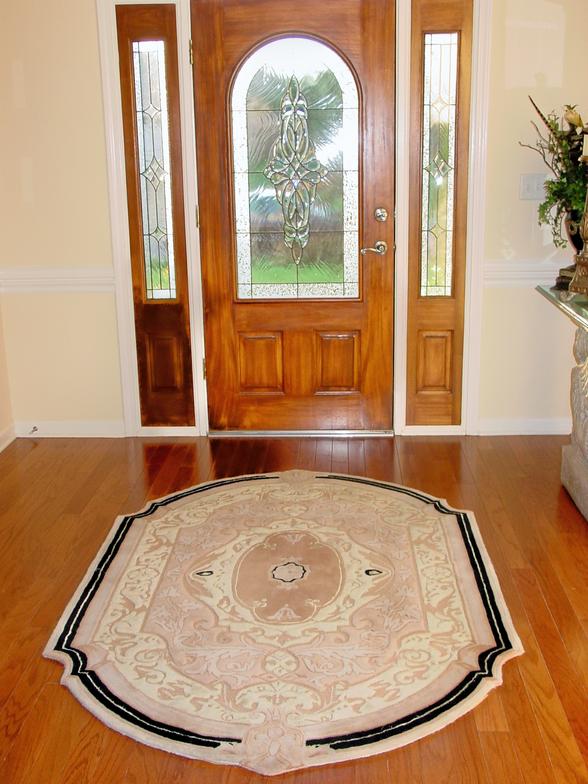 We always suggest using good quality rugs. We selected a round wool rug and an oval wool rug for these foyer areas. The rug shouid be the right design and size to compliment the style of the home and funishing used in the room. Rugs will add style, color and function to your space.