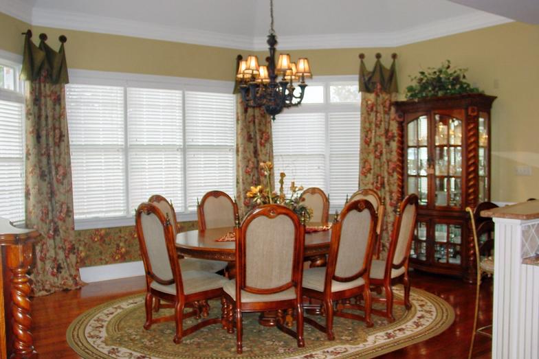 Our designer selected custom upholstery pieces and occasional tables and chairs in the Great Room. An oval wood dining table was selected for the large casual dining/breakfast area. Different textures was used such as metal and marble coffee and end tables in the Great Room and cherry wood finishes on table, china and hutch in Dining Area.