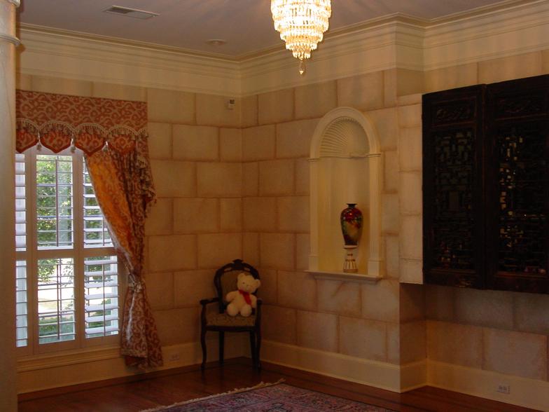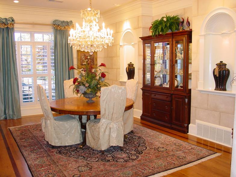 This Total Room Design Plan was not only needed here to fill the empty Dining Room space, but the client was also preparing to sell the home, so our designer worked in a smaller budget selecting used and cosignment furniture pieces such as the table and chairs and china cabinet. We then added simple beautiful custom window treatments, artwork, a floral center piece and decorative urns to place in the niches. We kept the client's existing rug and had the larger chandelier from another area in the home placed above the dining table. This design plan is excellent for someone needing to "Stage" the home for resale.
